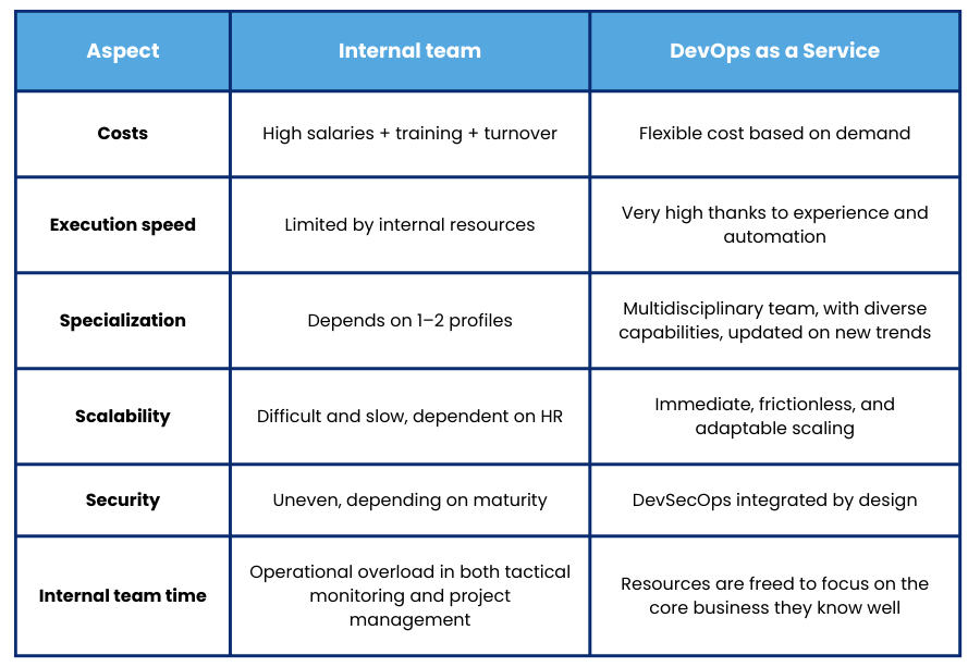 In a context where agility, specialization, and efficiency are key, outsourcing the improvement and maintenance of technological infrastructure, along with associated DevOps processes, has become an option that makes sense from a business management and financial perspective. The DevOps as a Service (DaaS) model convinces CIOs, CTOs, and CFOs because it provides expert, up-to-date, and multidisciplinary support without the structural cost of hiring staff directly.