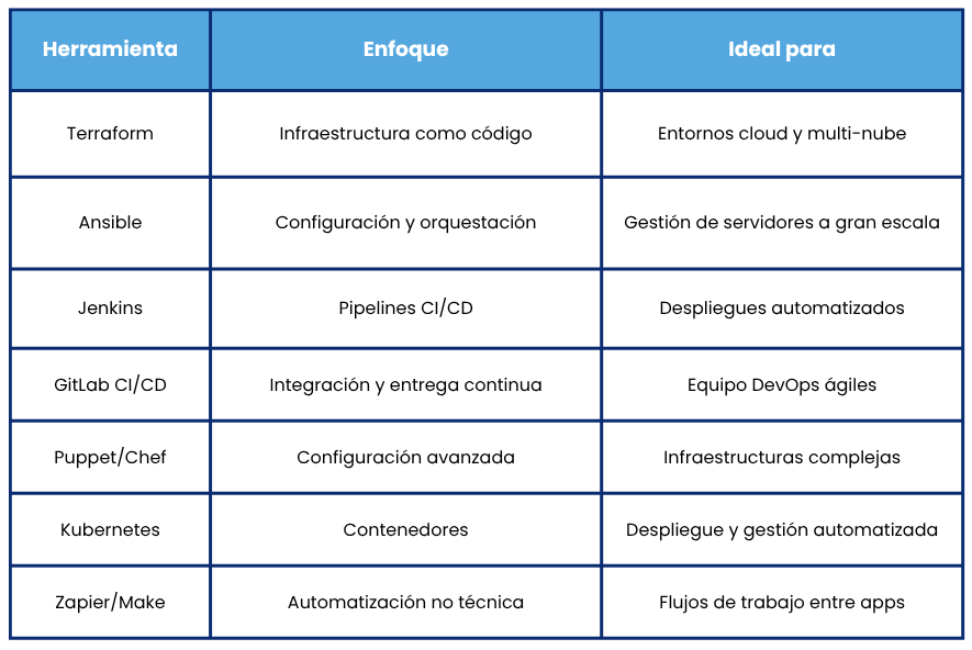 Cada una cubre una capa distinta de automatización, desde la infraestructura hasta los procesos de negocio.