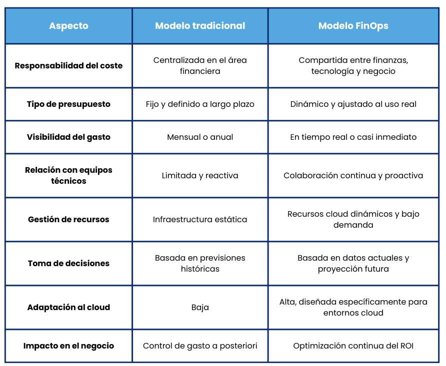 Mientras el enfoque tradicional se apoya en presupuestos fijos y revisiones periódicas, FinOps trabaja con costes variables, visibilidad continua y responsabilidad compartida entre finanzas, tecnología y operaciones.