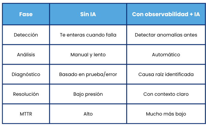 La combinación de observabilidad avanzada e inteligencia artificial permite mejorar la velocidad, la precisión y la capacidad de respuesta ante incidencias.